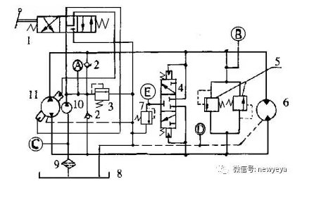1-手動(dòng)變量操作機(jī)構(gòu);2-單向閥;3-中位補(bǔ)油壓力安全閥;4-梭動(dòng)閥;5-系統(tǒng)壓力安全閥;6-馬達(dá);7-背壓閥;8-油箱;9-進(jìn)油濾清器;10-補(bǔ)油泵;11-主泵