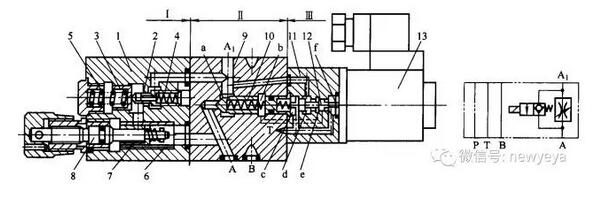 1-調(diào)速閥閥體,2-減壓閥;3-平衡閥;4,5-彈簧;6-節(jié)流閥套;7-節(jié)流閥芯,8-節(jié)流閥調(diào)節(jié)桿;9-主閥體; 10-錐閥;11-先導閥體;12-先導閥;13-直流濕式電磁鐵;a,b,c,d,e,f-腔