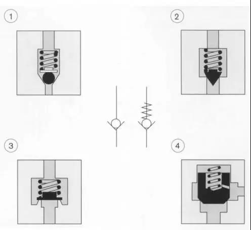 單向閥(止回閥)的主要功能是在一個(gè)方向阻止油液的流動(dòng),而在反方向則實(shí)現(xiàn)自由流動(dòng)。阻止流動(dòng)必需無(wú)泄漏,因而這類閥總是采用座閥結(jié)構(gòu)。密封元件有鋼球(1),錐閥芯(2),閥座(3)和插裝閥(4)幾種類型。只需很小的液壓力,密封元件就可克服彈簧力而開(kāi)啟閥門。圖1表示這一基本原理。