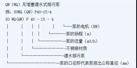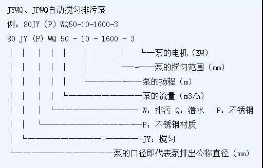 Q:潛水 W:排污 G:管道 Y:液下 N:泥漿 Z:自吸 L:立式 AS:撕裂 JY:攪勻 P:不銹鋼 B:防爆