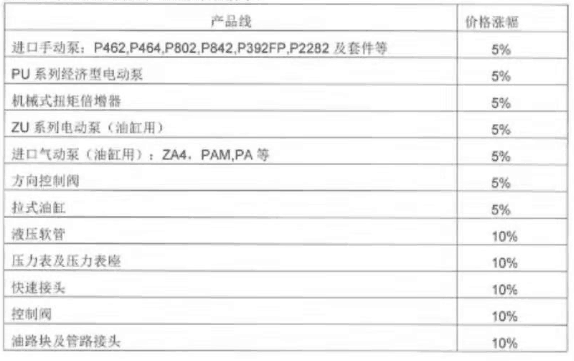 (一)所有Enerpaca標準產(chǎn)品價格漲2%。